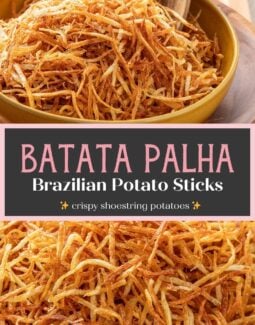 Batata palha is a beloved Brazilian side dish/topping made with very thinly cut potatoes fried until crisp, golden, and ridiculously crunchy. Think of it as Brazil’s answer to shoestring potatoes, only better (yes, I said it! 😉 ).