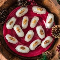 If you’re not familiar with it, this walnut candy consists of a rich walnut paste covered in fondant icing. Simple but very delicious and a hit at special parties, like weddings and Christmas/New Year’s Eve.
