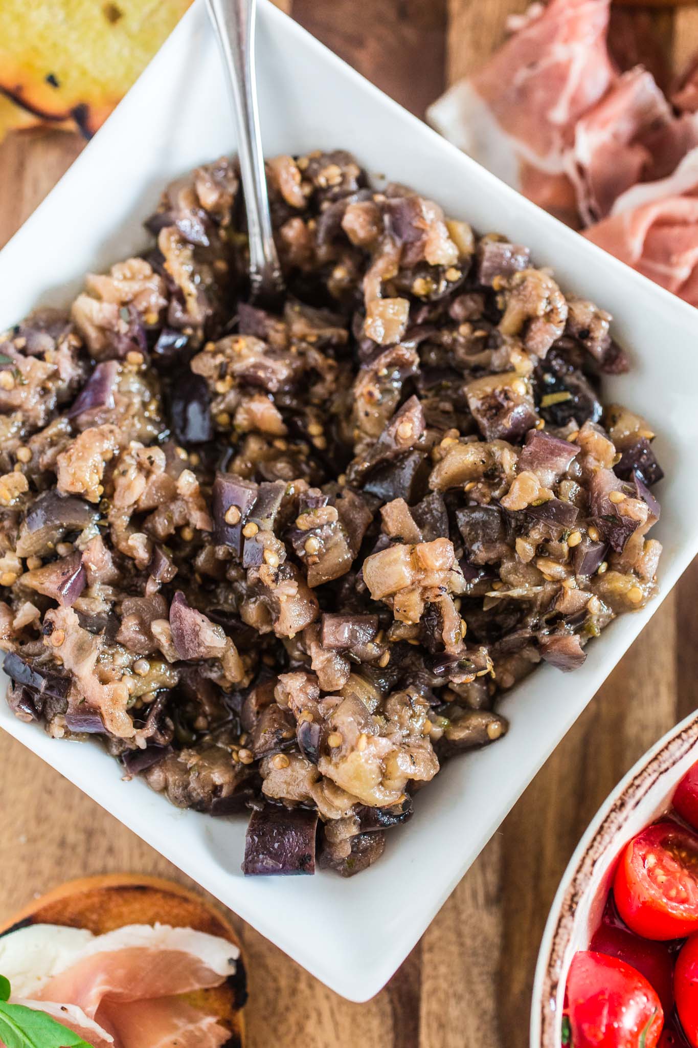 • Add the remaining ingredients and stir to combine. Transfer to a mason jar or other container with a tight-fitting lid and add more olive oil to cover eggplant, if needed. Marinate eggplant, covered and chilled, at least 4 hours. Bring to room temperature before serving.