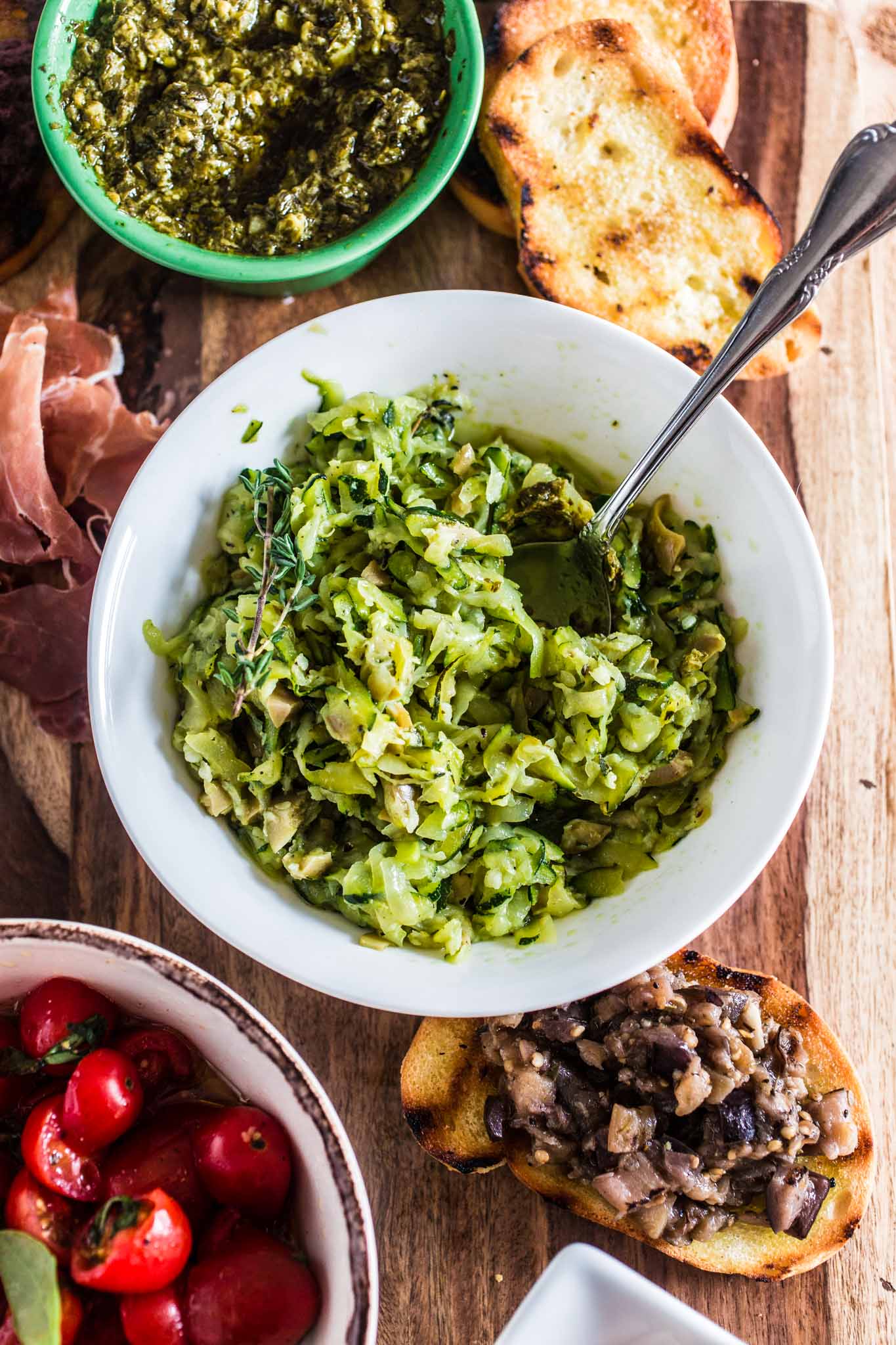 In fact, some spreads, like the Marinated Eggplant or the Marinated Zucchini, will benefit from staying overnight in the fridge, soaking up all the flavors from the marinade.