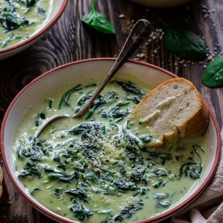 January is National Soup Month and there’s no better way to warm up than with a bowl of this Cream of Spinach Soup! Creamy, rich and so easy to make. Dinner will be ready in less than 20 minutes!