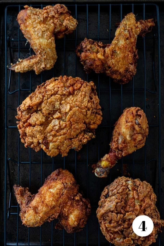 • Remove the fried chicken to a wire rack set over a baking sheet. Let it dry and rest for about 10 minutes before serving.