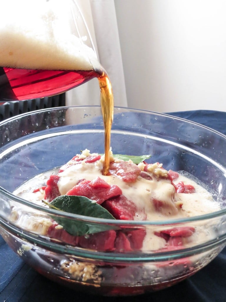 Até agora eu falei de todas as comidas populares na Bélgica, mas deixei a cerveja pro fim porque ela vai ser um ingrediente importante na nossa receita de hoje. A Bélgica produz mais de 1100 tipos de cerveja, o que é impressionante dado o tamanho pequeno do país. Na média, os belgas bebem 84 litros de cerveja por ano. (Acho que meu pai bebe por aí também! rs). A cerveja belga é um estudo em si só, que eu espero poder dominar no futuro. Nesse meio tempo, vamos focar na cerveja que é geralmente usada para Carbonnades, a Flemish Red. É uma cerveja levemente forte com uma cor marrom-avermelhada e um gosto agridoce peculiar. Apesar de muitas cervejas renderem deliciosos ensopados de carne, o caráter único do Carbonnade Flamande vem só de uma Flemish Red. A marca que eu usei foi a Monk’s Café, mas a mais famosa se chama Rodenbach. Não faço noção se é fácil achar cervejas belgas importadas aí no Brasil. Sei que vocês podem encomendar pela internet com facilidade, mas não sei de nenhuma loja física, por exemplo. (Pesquisei no Google e a Veja SP cita algumas opções: Casa da Cerveja, Cervejoteca, Empório Alto dos Pinheiros, Laus Beer e Mr. Beer Cervejas Especiais!)