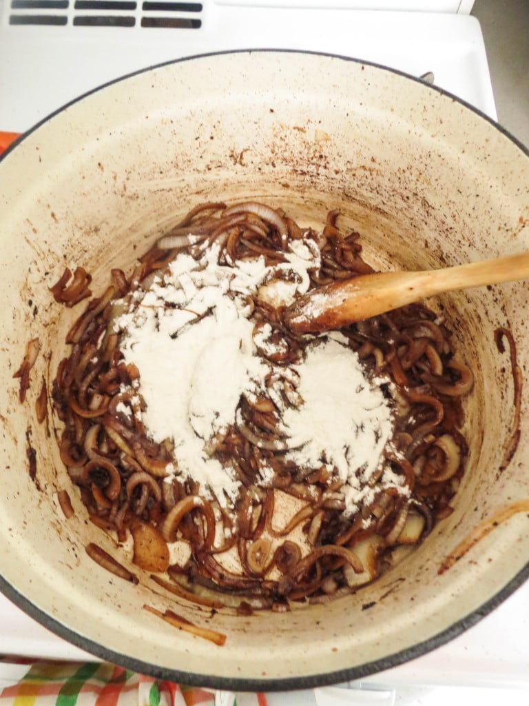 - Adicione a farinha e cozinhe por uns 2 minutos até que a farinha cozinhe e as cebolas fiquem totalmente cobertas de farinha.