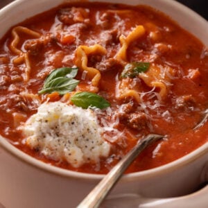 A cozy, one-pot lasagna soup made with ground meat, rich tomato broth, tender noodles, and a creamy ricotta and Parmesan finish. All the flavors of classic lasagna with a fraction of the effort!