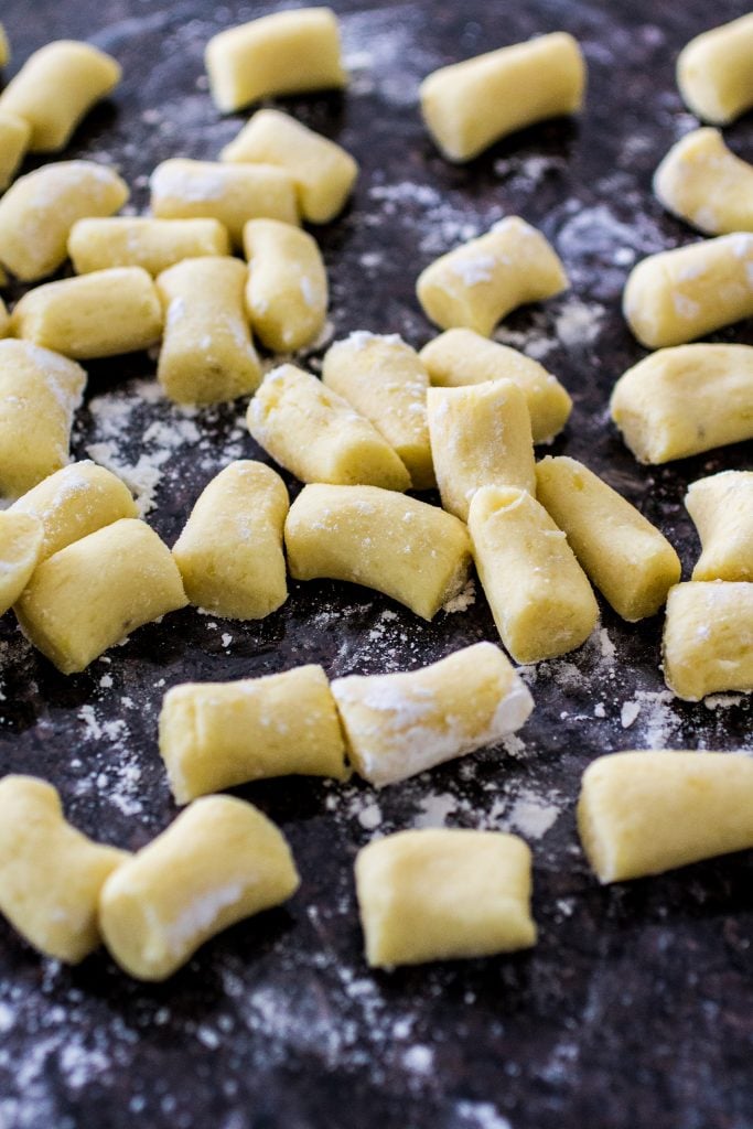 - Cut the dowels into 1 inch long gnocchi and transfer the gnocchi to a floured area.