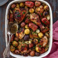 This oven roasted chicken dinner is delicious and very easy to assemble! Marinated skin-on chicken pieces are cooked in the same pan with sausage, potatoes and onions, making this dish perfect for even the busiest weeknights.