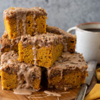 Yes, you will have to wait longer to enjoy your cake. But you also don’t need to stay home babysitting it. Go enjoy a crispy autumn walk and come back to a rewarding slice of pumpkin coffee cake!