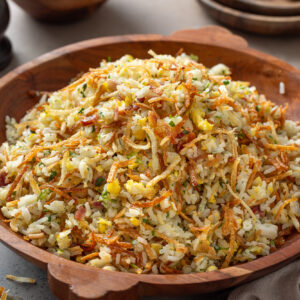 Arroz Biro-Biro is a classic Brazilian steakhouse rice made with fluffy white rice, crispy bacon, softly scrambled eggs, fresh herbs, and crunchy batata palha. This easy Brazilian fried rice comes together in one pan and is the perfect side dish for grilled meats.